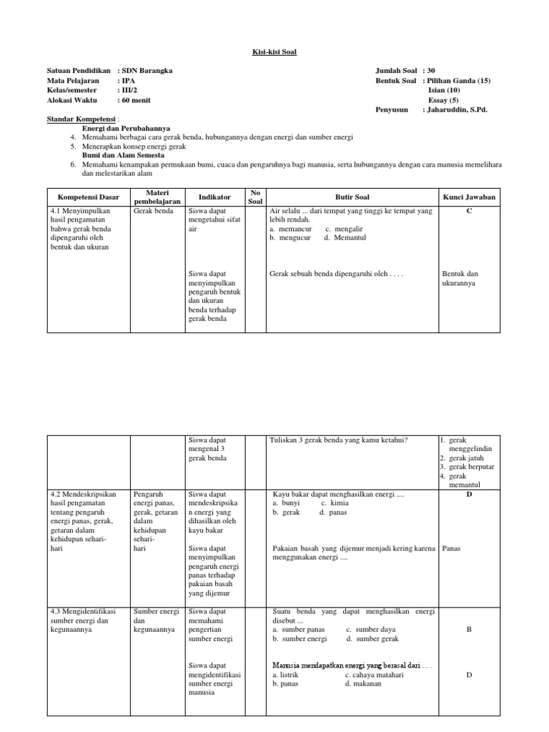 Dalam konteks evaluasi, kisi-kisi soal merupakan instrumen penting yang memandu guru dalam menyusun soal ujian yang relevan, valid, dan reliabel. Kisi-kisi ini memastikan bahwa soal yang dibuat mencakup seluruh cakupan materi yang telah diajarkan sesuai SK/KD, serta mengukur berbagai tingkat kemampuan siswa, mulai dari ingatan, pemahaman, hingga aplikasi sederhana. Artikel ini akan mengupas tuntas tentang kisi-kisi soal IPA Kelas 3 SD berdasarkan SK/KD, memberikan panduan komprehensif bagi guru dan orang tua dalam mempersiapkan evaluasi yang efektif.